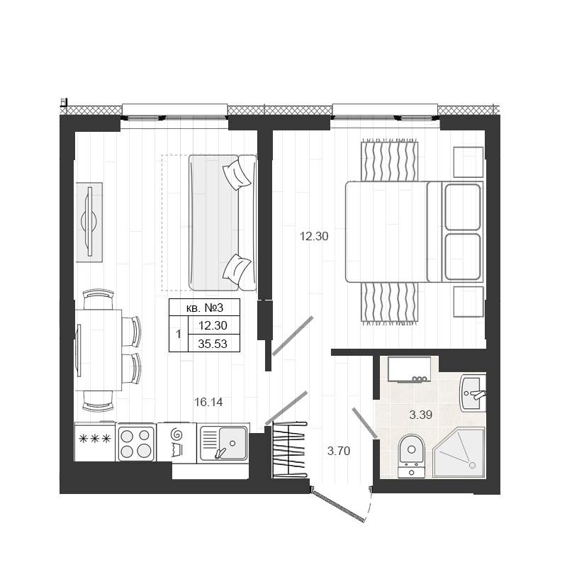 общая 35,6 м2, жилая 12,3 м2, кухни 16,14 м2 |