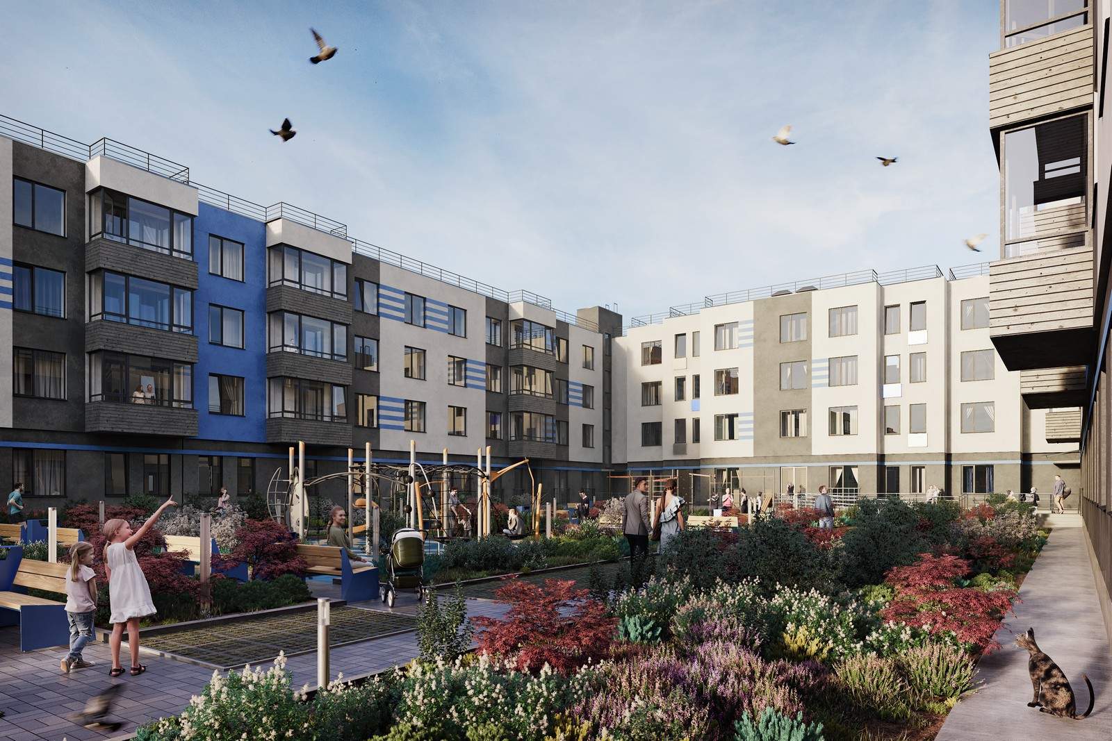 В 10-ти четырехэтажных корпусах сможет поселиться 1171 семья. Дома располагаются блоками, образуя уютные закрытые и безопасные дворы с большим количеством зеленых насаждений и с зонами отдыха для взрослых и детей.