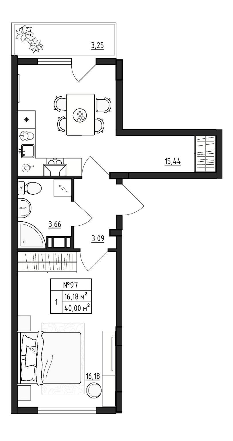 общая 40 м2, жилая 16,18 м2, кухни 15,44 м2 |