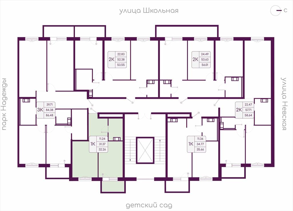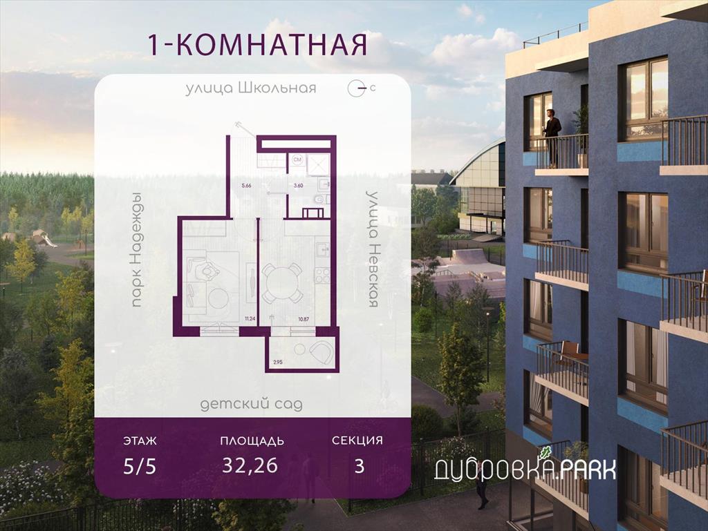 | Продаётся 1- комнатная квартира площадью 32,26 кв.м. на 5 этаже 5-этажного дома в ЖК «Дубровка. Park». Номер квартиры 83.