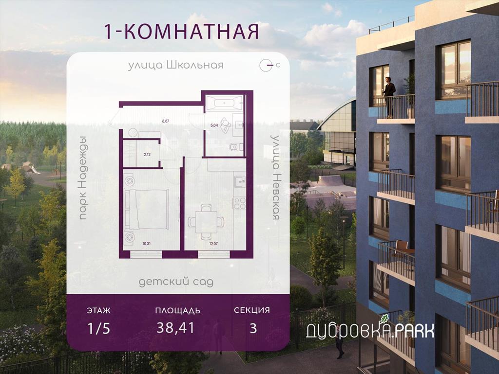 | Продаётся 1- комнатная квартира площадью 38,41 кв.м. на 1 этаже 5-этажного дома в ЖК «Дубровка. Park». Номер квартиры 63.