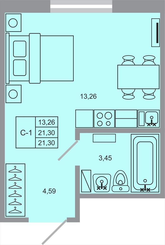 общая 21,3 м2, жилая 13,26 м2, кухни 0 м2 |