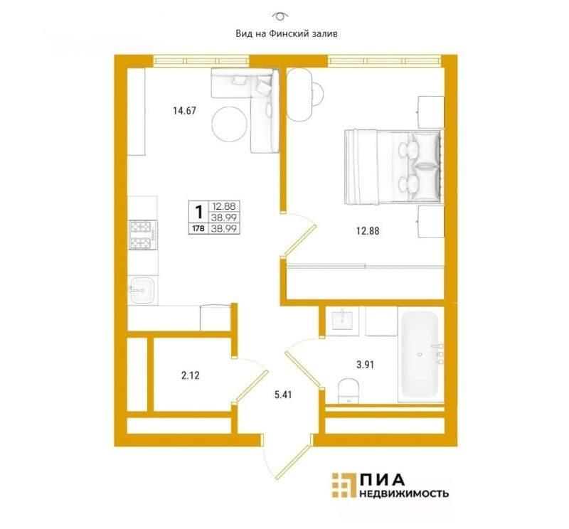 общая 38,99 м2, жилая 12,88 м2, кухни 14,67 м2 |
