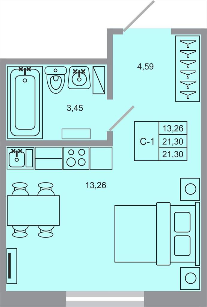 общая 21,3 м2, жилая 13,26 м2, кухни 0 м2 |