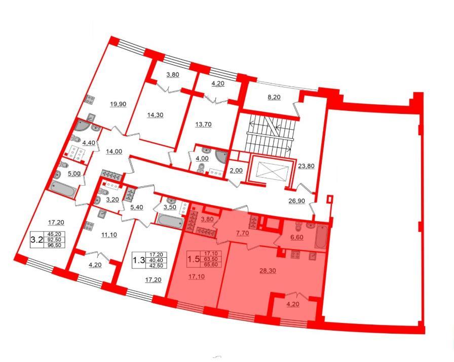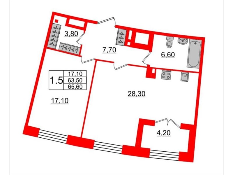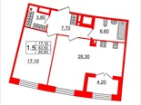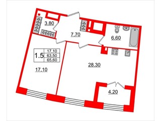 общая 65,6 м2, жилая 17,1 м2, кухни 28,3 м2 |