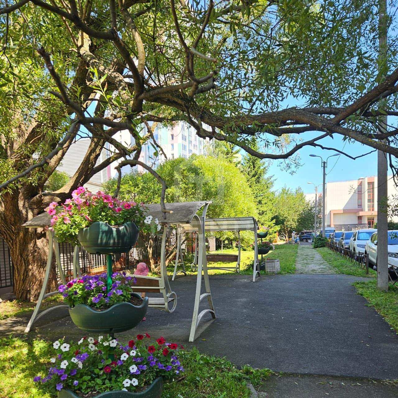 Двор тихий, зелёный, с соснами, ёлками, плодовыми деревьями, цветущими клумбами, качелями, скамейками и безопасными детскими площадками.
