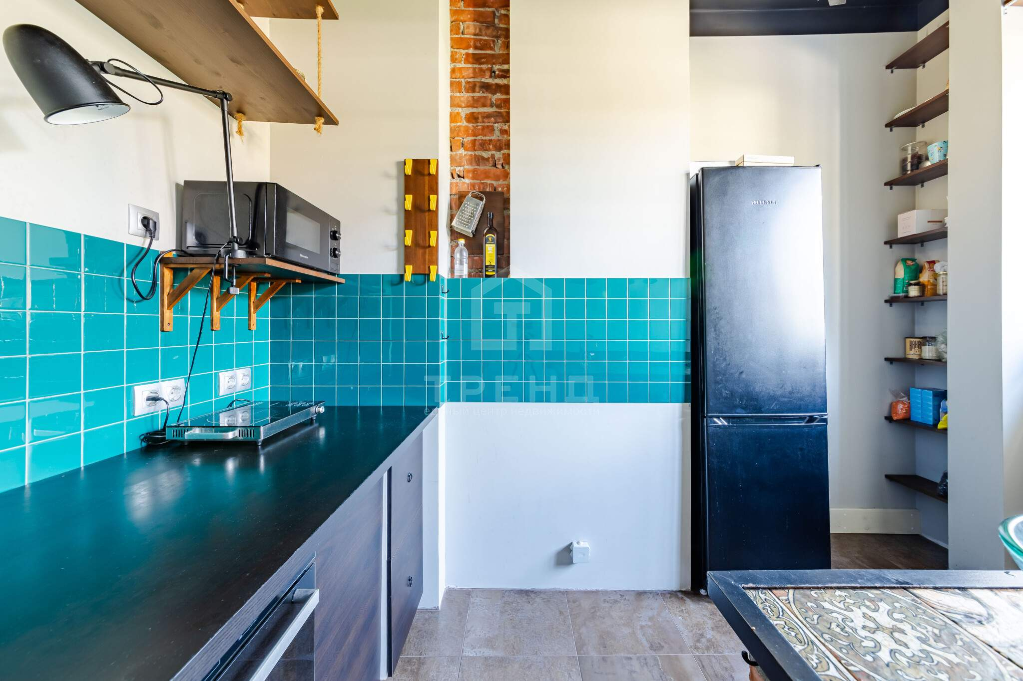 На кухне тёмные полы, посудомоечная машина, холодильник, духовка, микроволновка, 3 сценария освещения, оставлена возможность для создания ещё двух сценариев при желании. Из окна кухни отрывается живописный вид на крону вишнёвого дерева, который весной будет радовать цветами, а летом плодами.