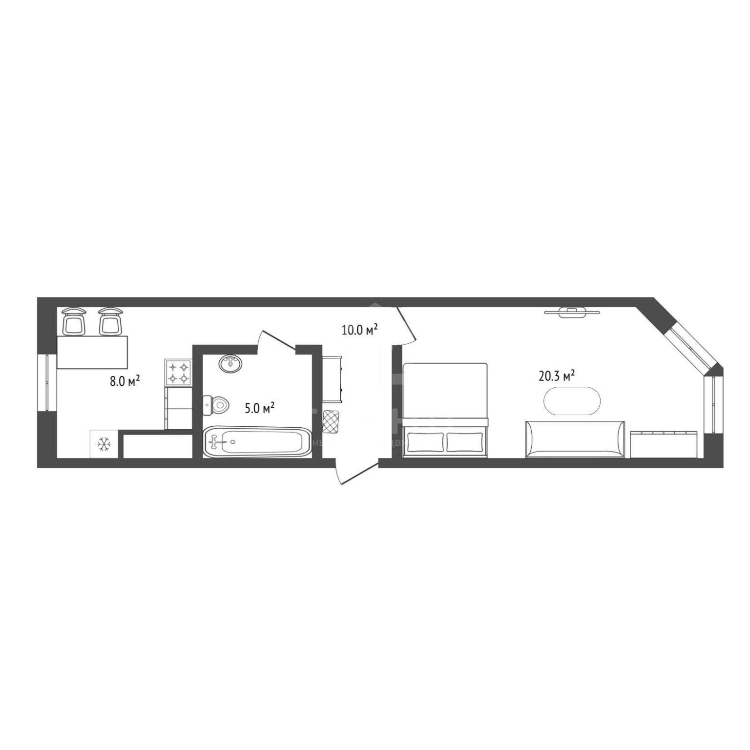 общая 42 м2, жилая 20 м2, кухни 8 м2 |