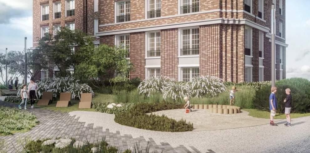 Закрытый двор расположится на стилобате, что обеспечит жильцам дополнительную приватность. На территории будут проложены гранитные дорожки, разбиты клумбы с элементами ландшафтного дизайна, высажены деревья, установлены скамейки. Во двор будут выходить террасы квартир на втором этаже (первый жилой) , где жильцы смогут организовать собственный палисадник