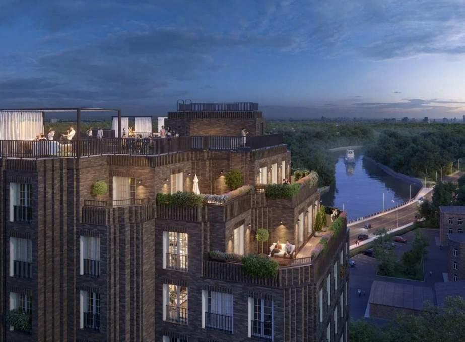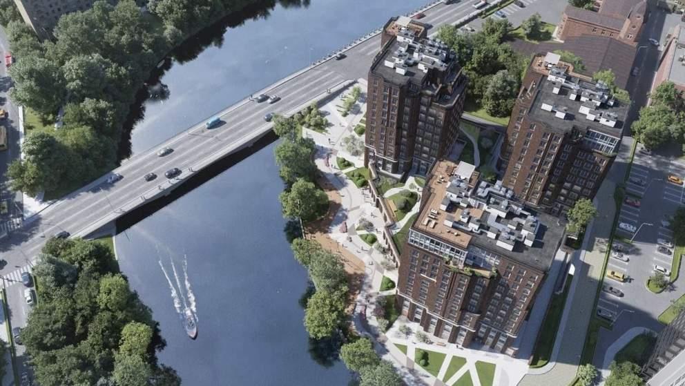 Облик дома выполнен в стилистике американского ар-деко. Для отделки фасадов выбран декоративный клинкерный кирпич благородного тёмного оттенка, который контрастирует со светлым бетоном соседних зданий.