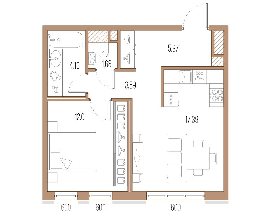 общая 44 м2, жилая 12 м2, кухни 17,39 м2 |