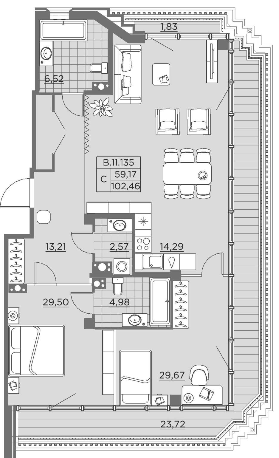 общая 107,1 м2, жилая 59,17 м2, кухни 26,09 м2 |