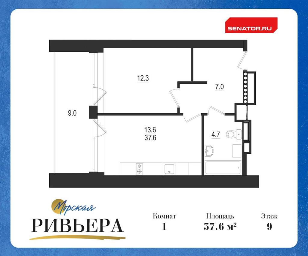Квартира располагается на 9 этаже 12-этажного дома в ЖК МФК Морская ривьера.