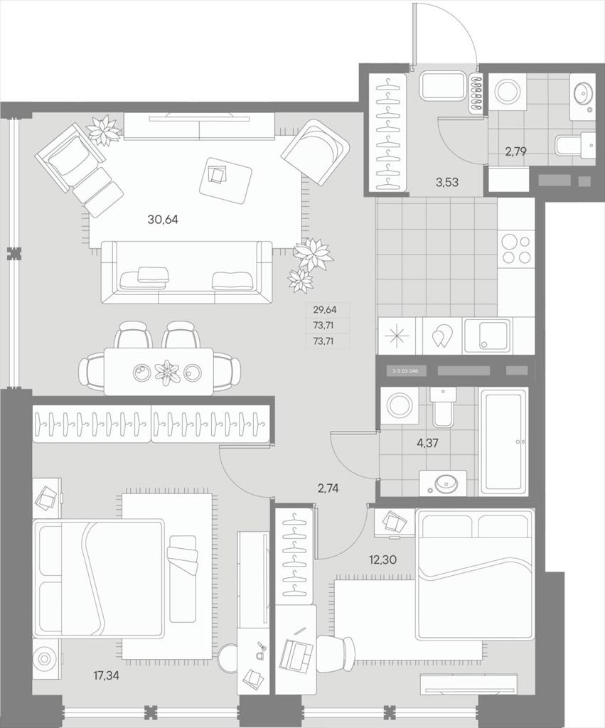 общая 73,72 м2, жилая 29,64 м2, кухни 30,67 м2 |