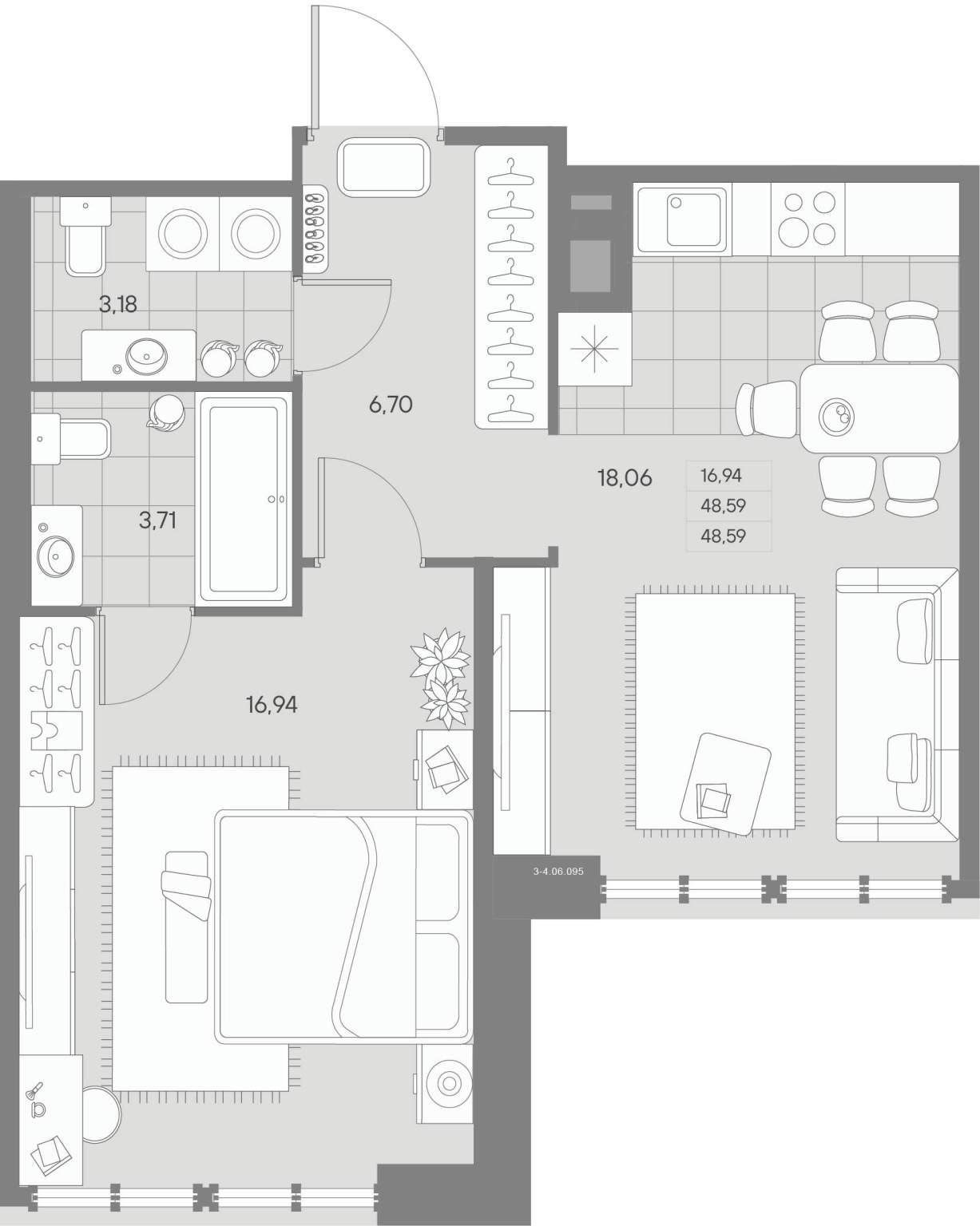 общая 48,59 м2, жилая 16,94 м2, кухни 18,06 м2 |