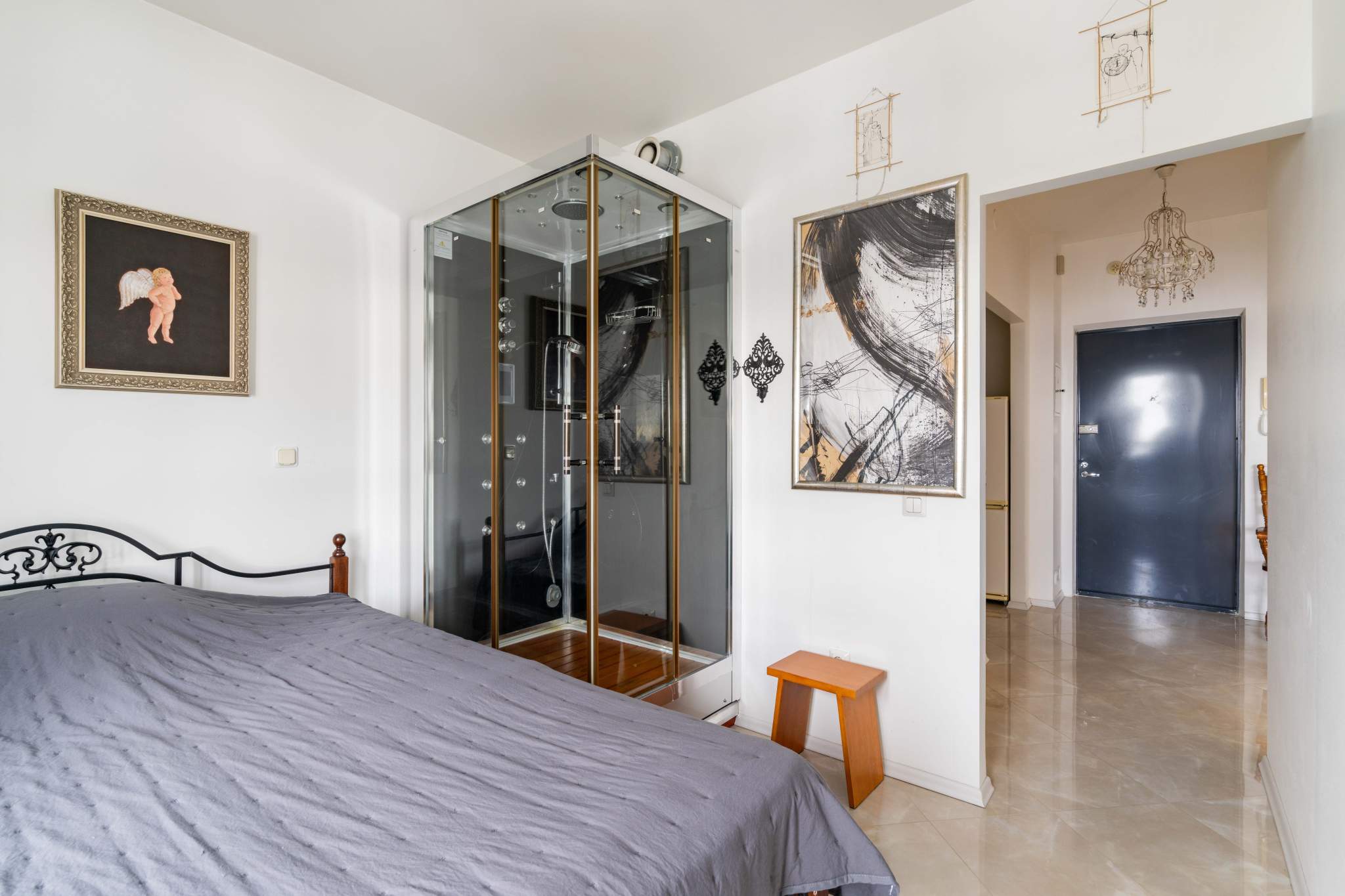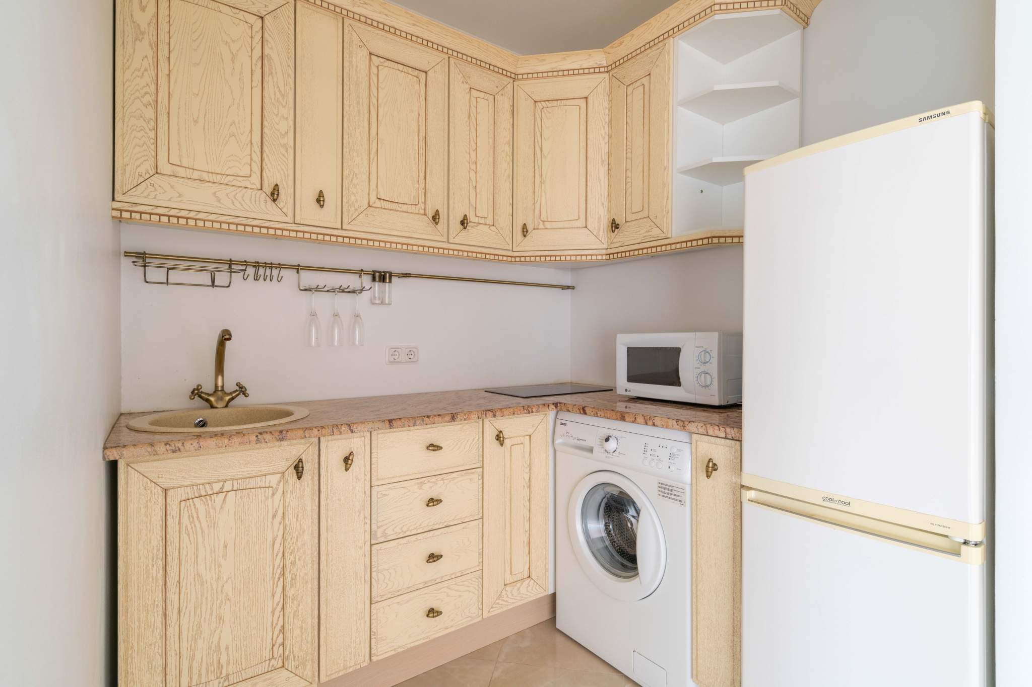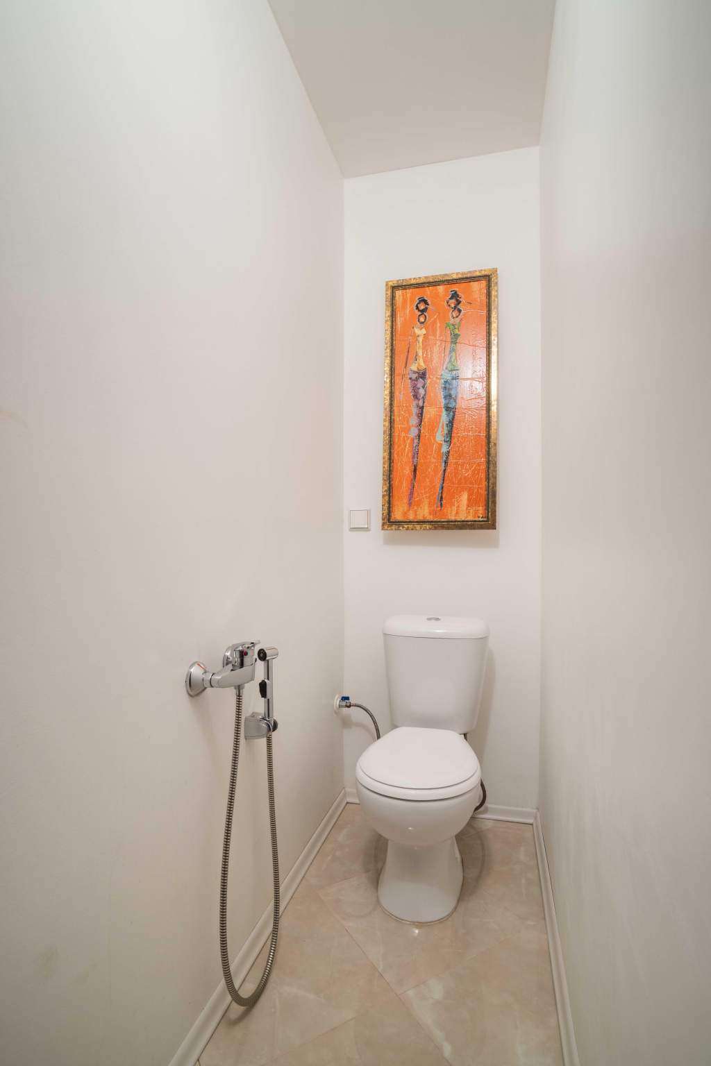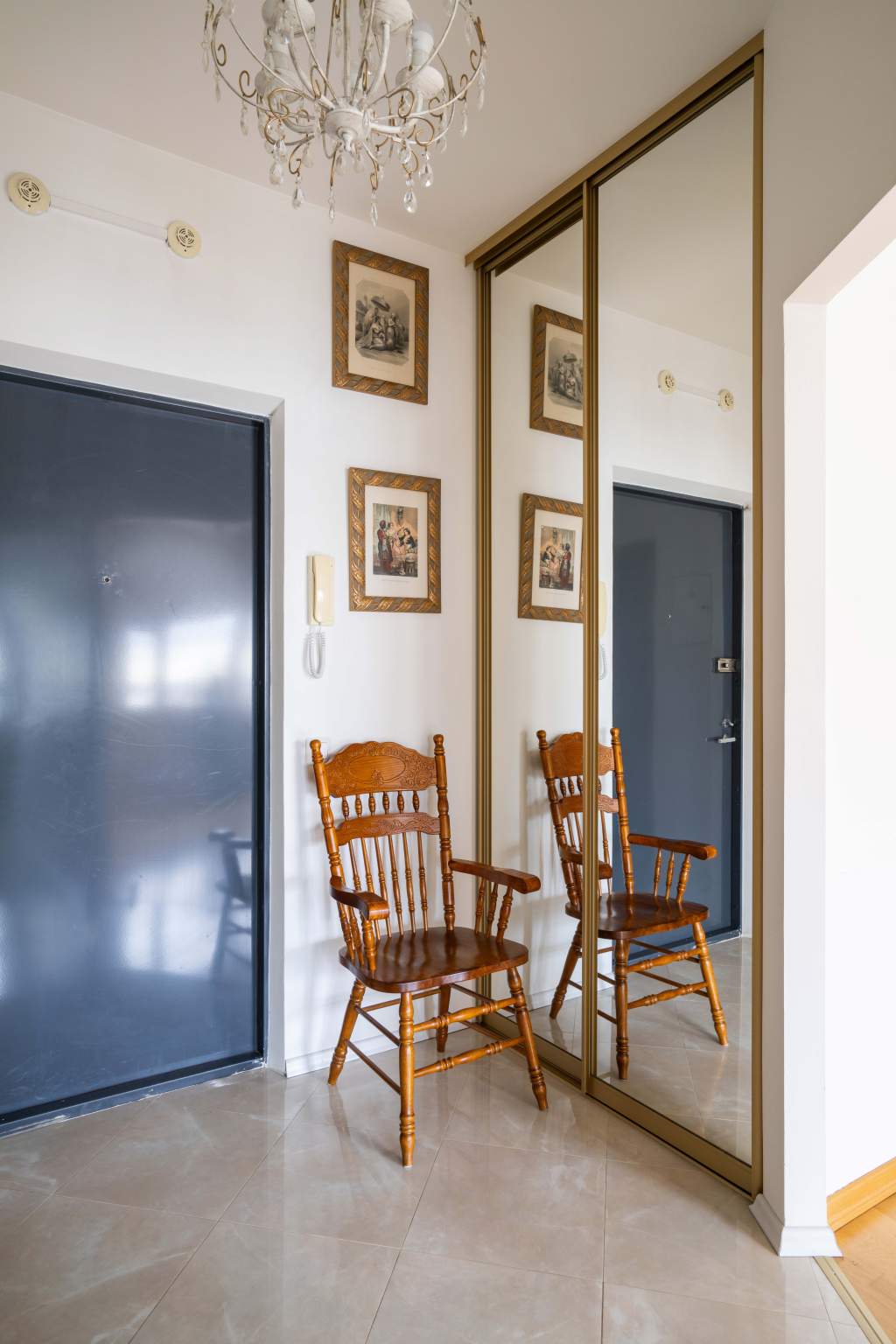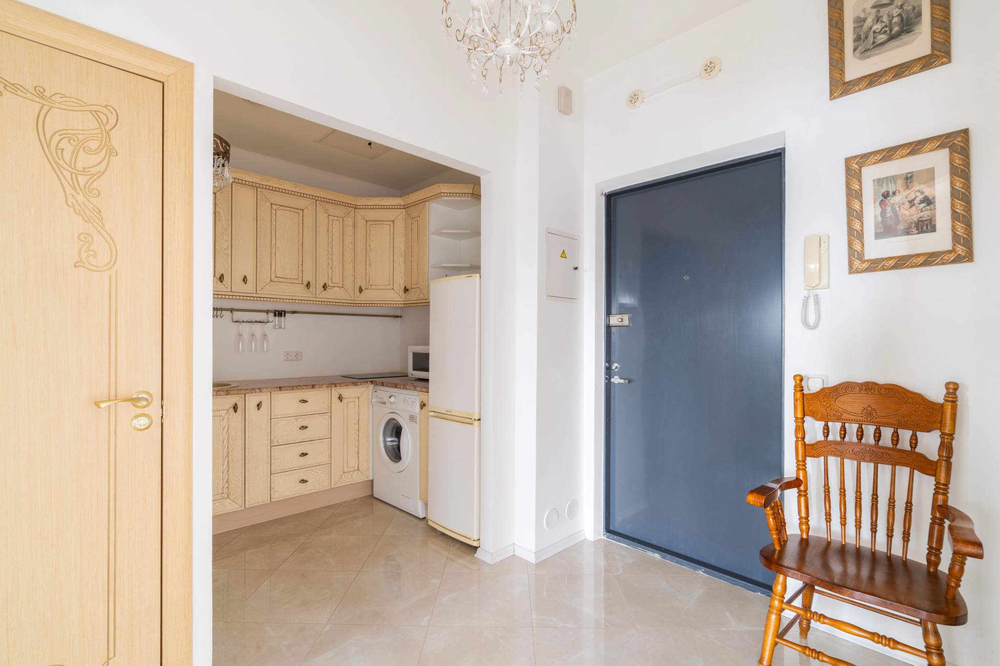 Дизайн выполнен в светлых приятных оттенках с темными акцентами. В квартире есть необходимая бытовая техника: варочная панель, микроволновая печь, стиральная машина, холодильник. Изюминкой квартиры является душевая кабина с функциями гидромассажа и хромотерапии производства Германии. Просторная квартира предоставляет возможность организовать пространство на свой вкус. Интерьер квартиры дополнен интересными картинами.