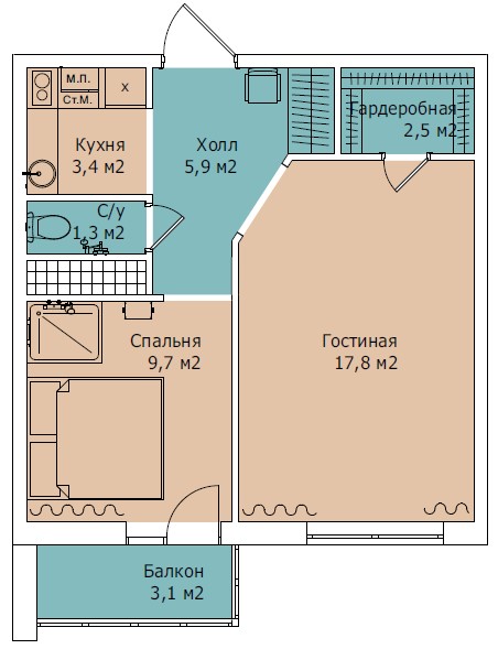 общая 40,8 м2, жилая 16 м2, кухни 3,4 м2 |