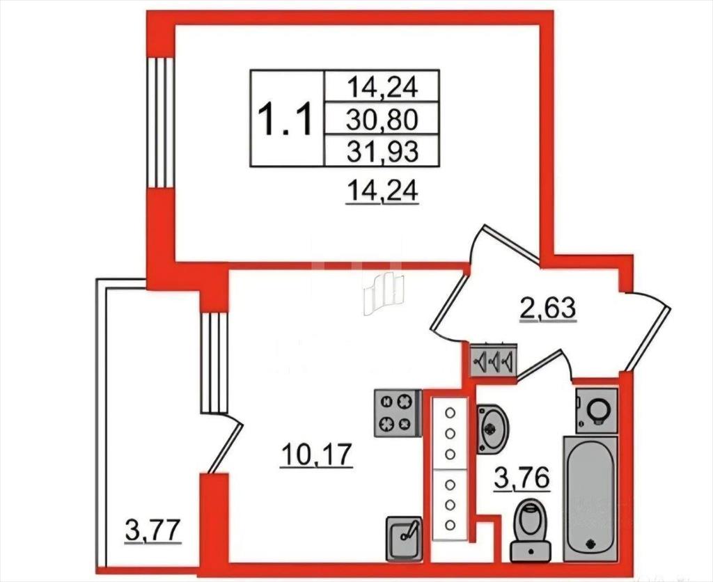 Площадь: Общая - 30,4 кв.м. , жилая - 14,2 кв.м. , кухня - 10,2 кв.м.