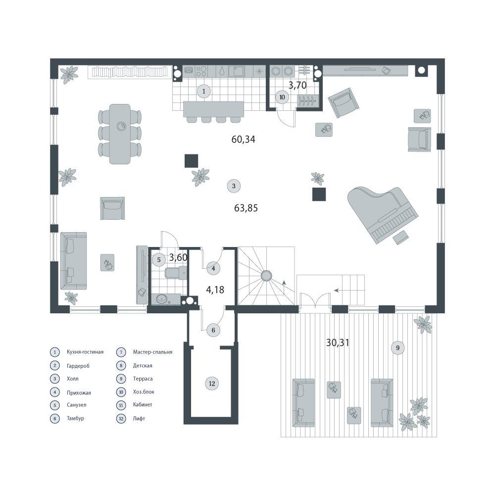 общая 250,9 м2, жилая 63,53 м2, кухни 63,92 м2 |