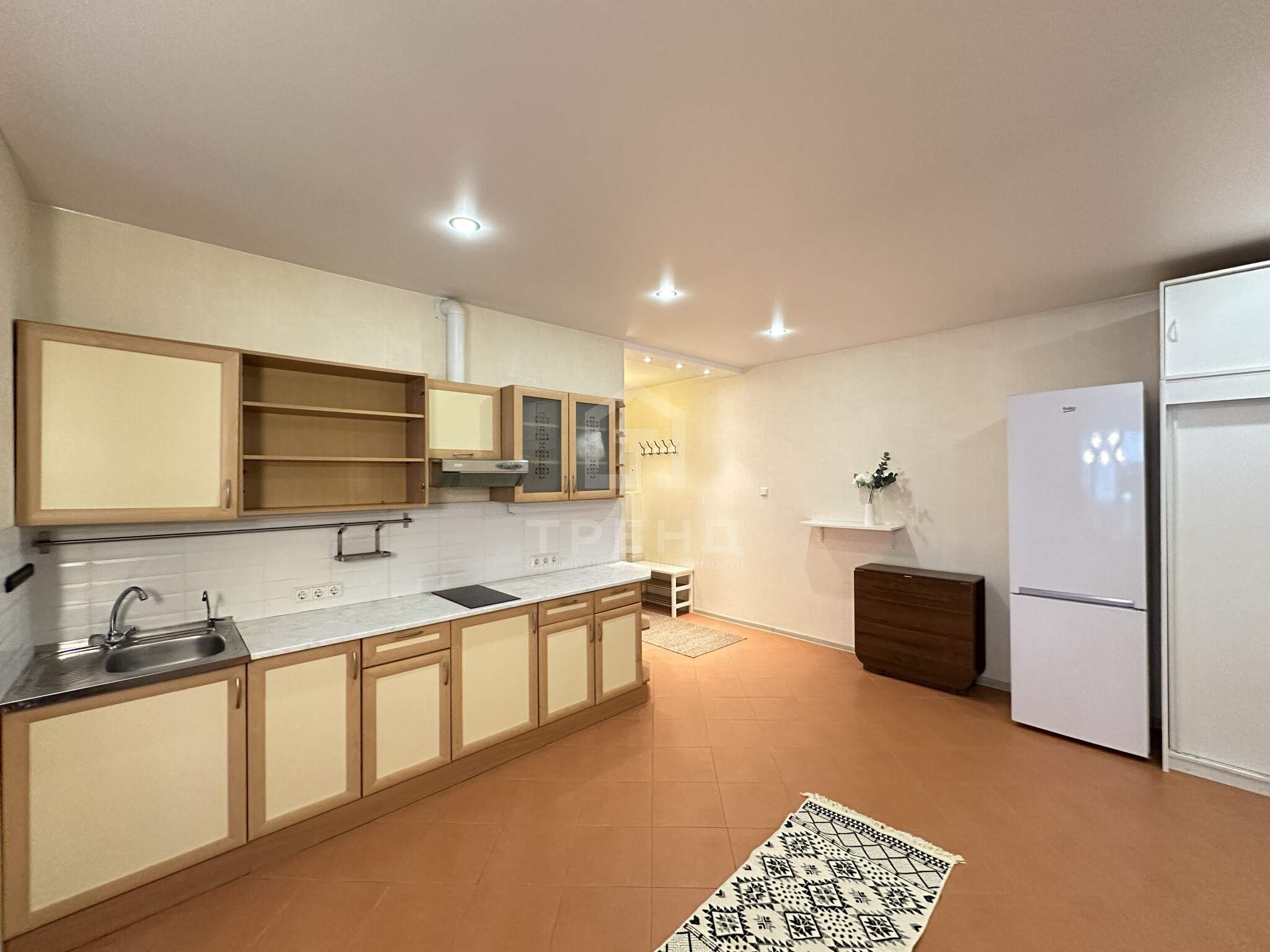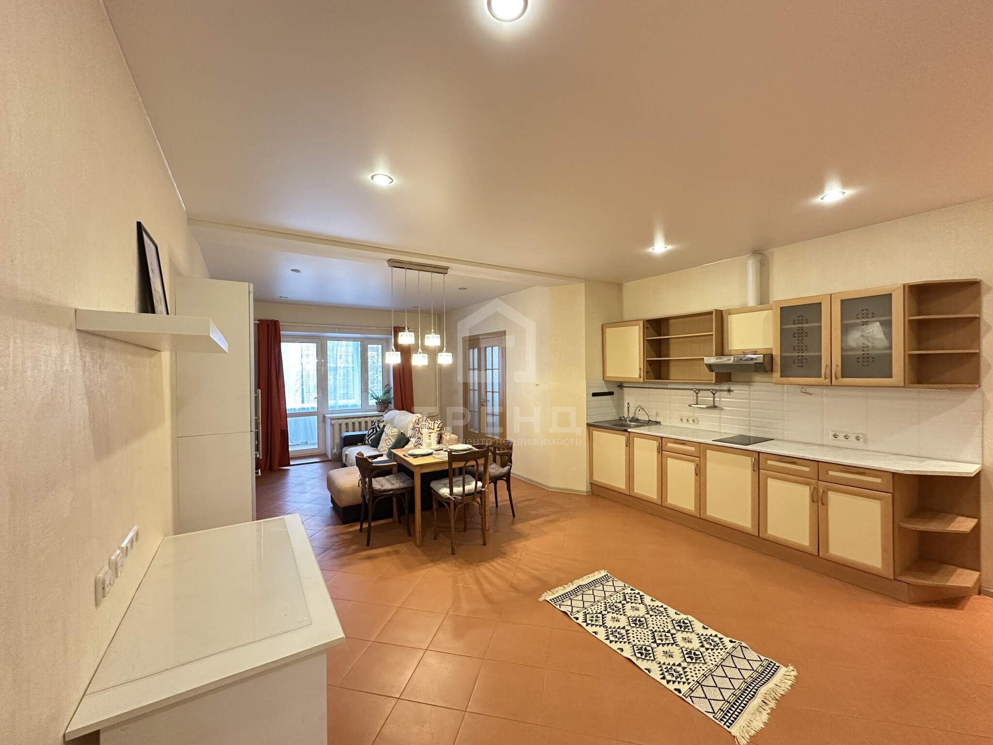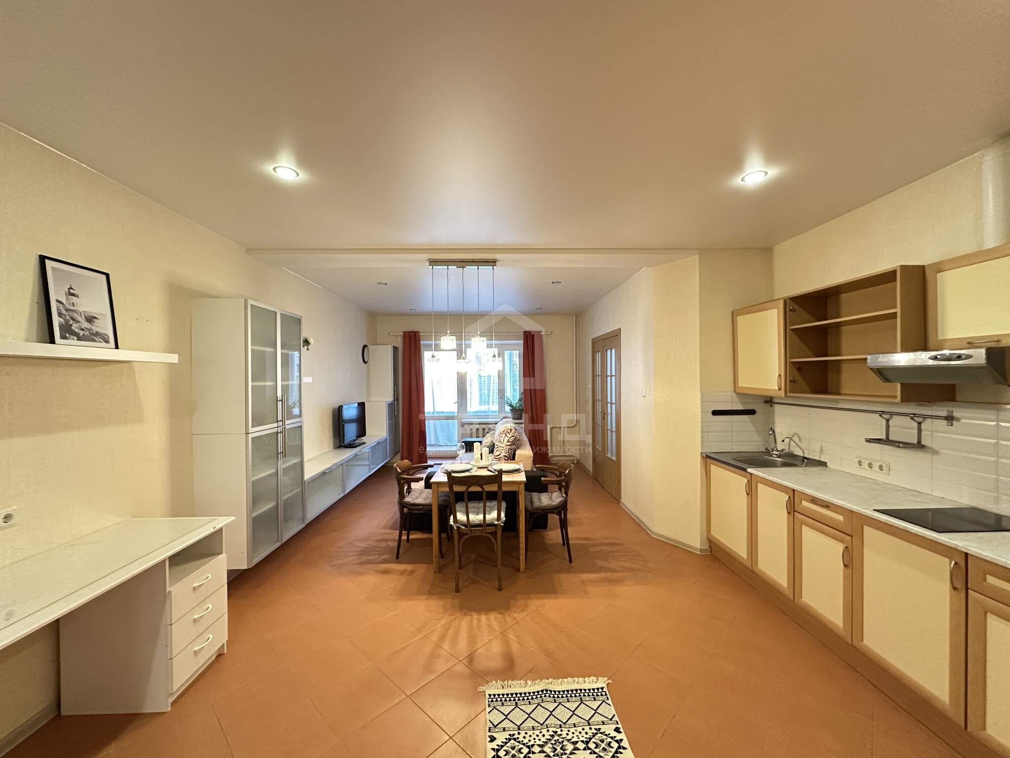 - Кухня-гостиная с выходом на большую лоджию, установлена варочная панель и вытяжка, тёплые полы.