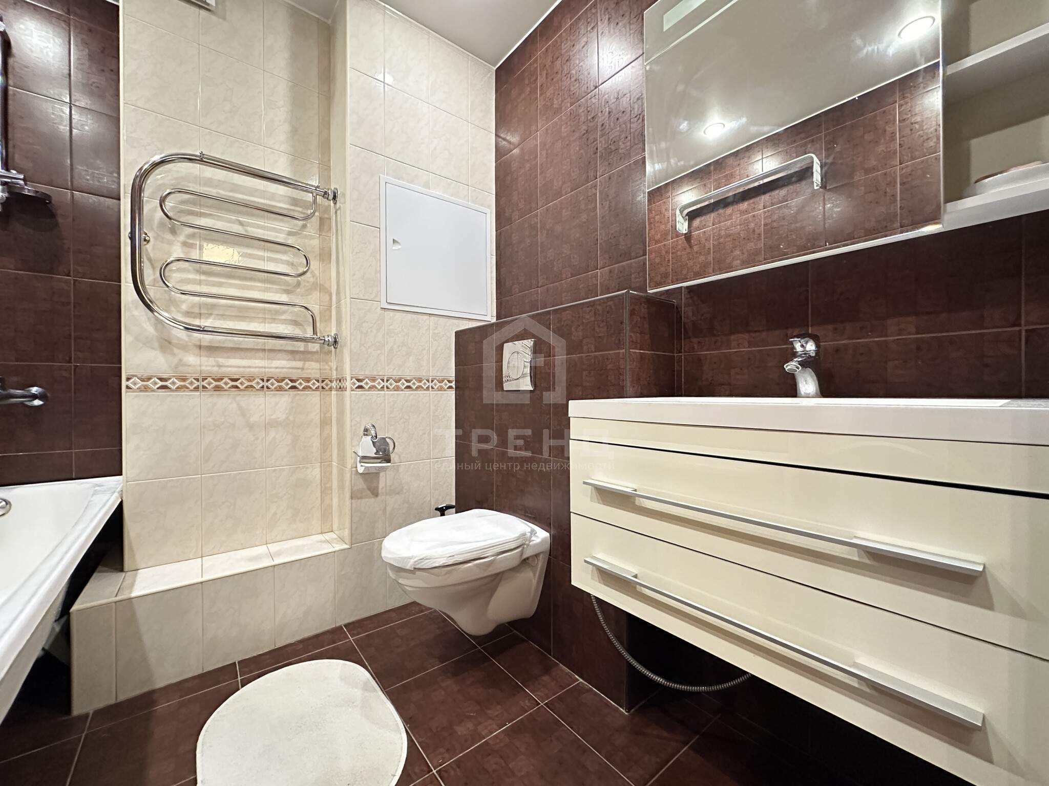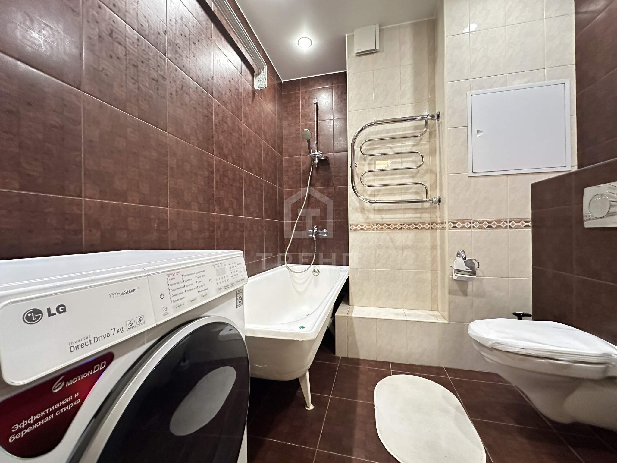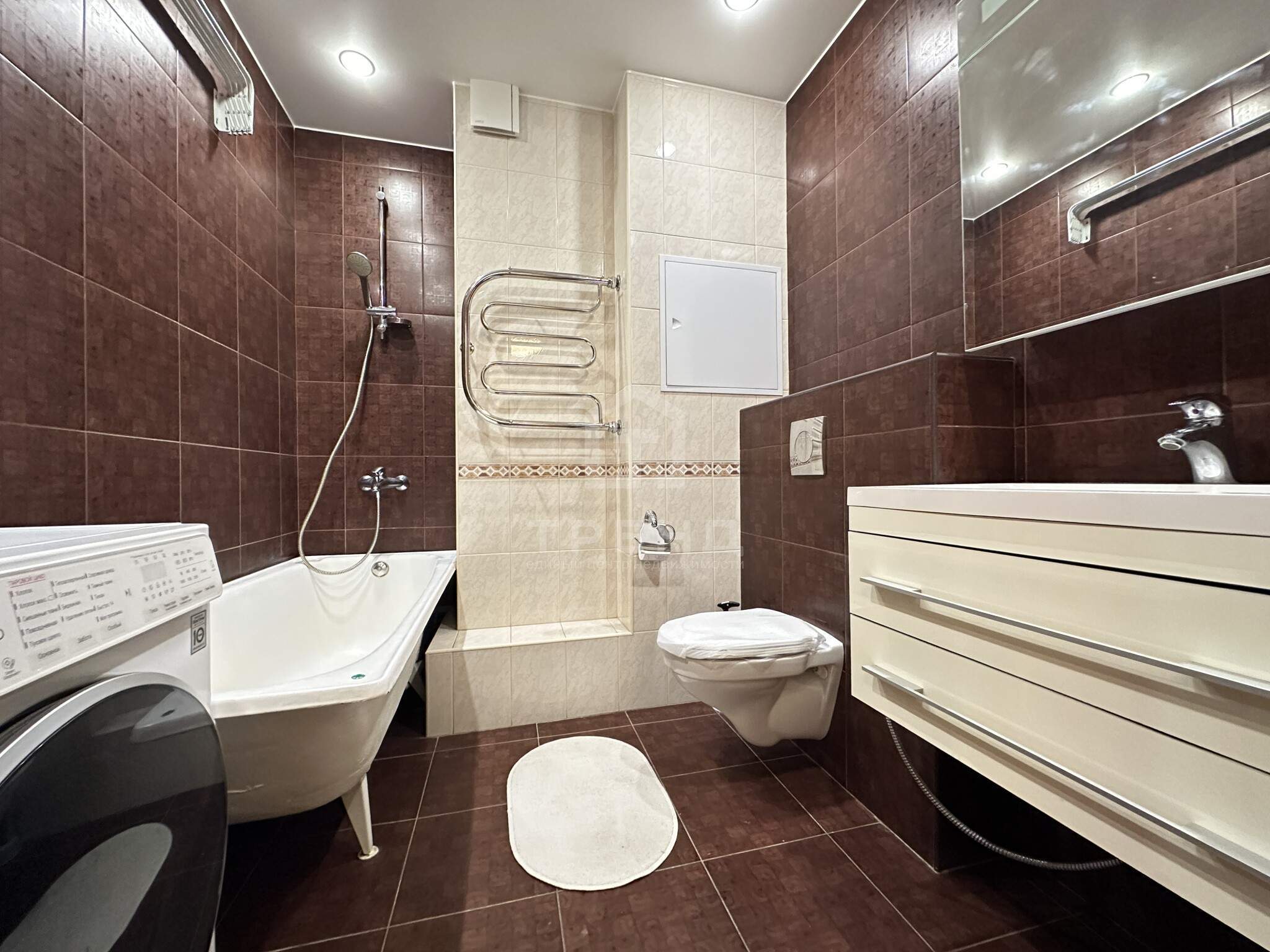 - Продуманный санузел: ванна, стиральная машина, гигиенический душ, принудительная вентиляция, тёплый пол.