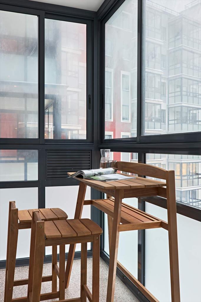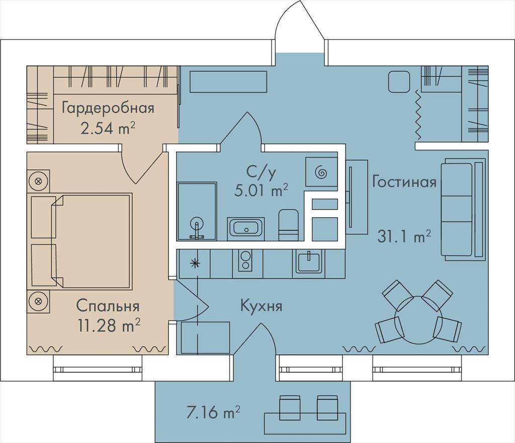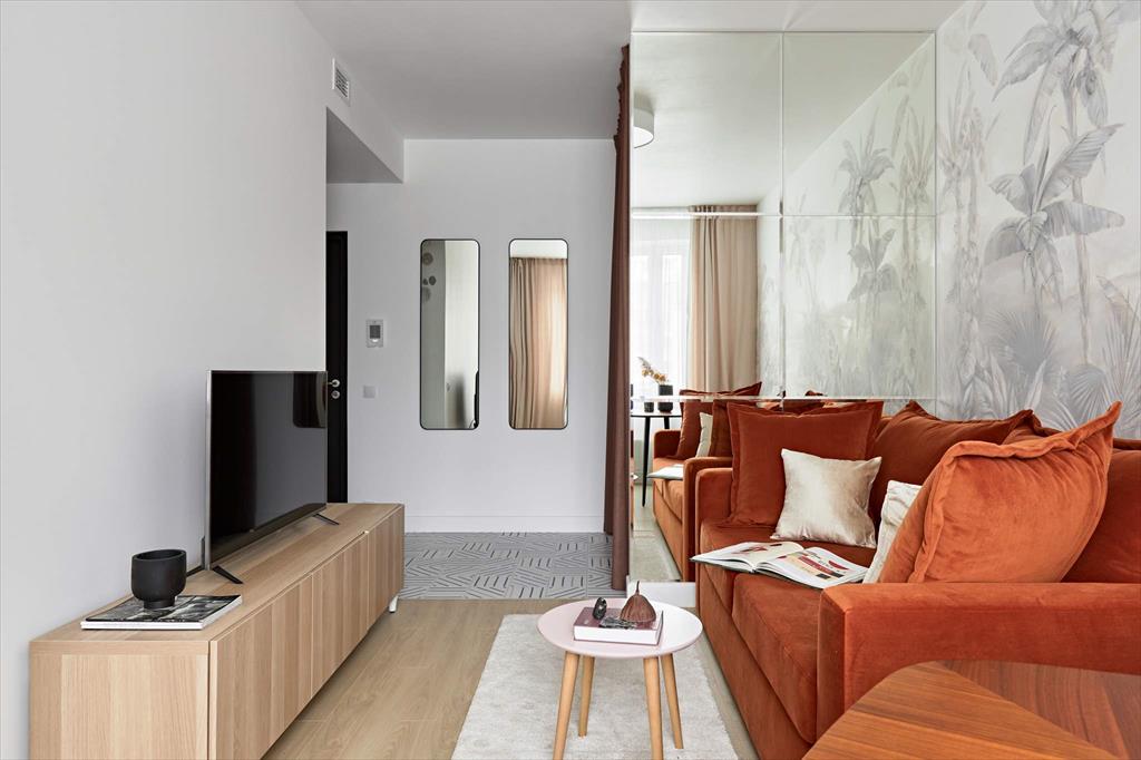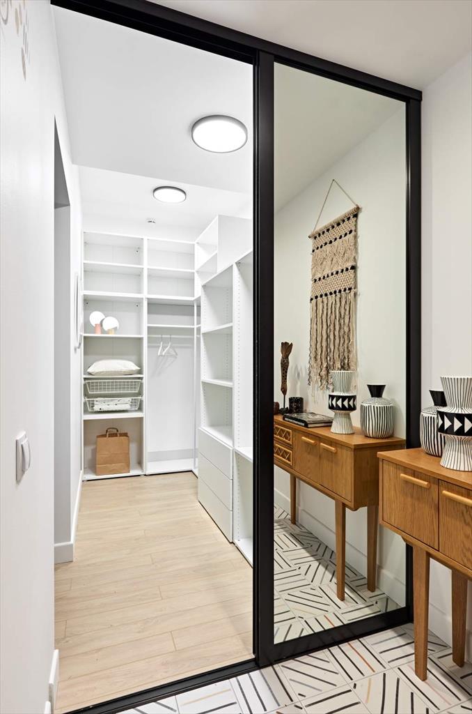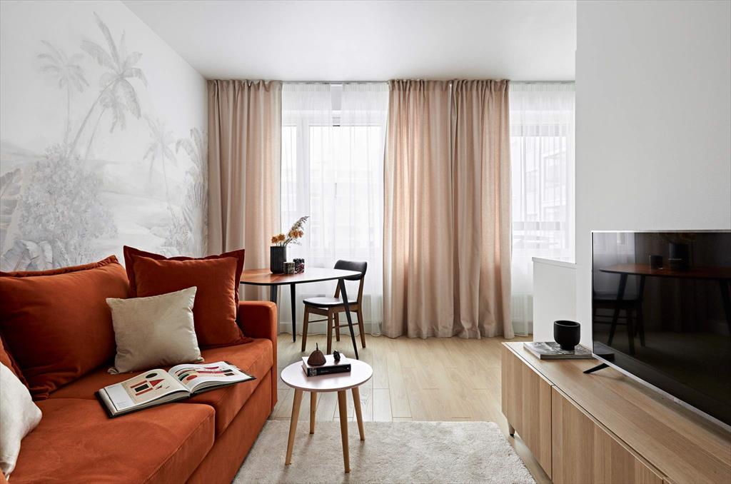 Квартира-вариация любимой всеми круговой планировки, где гостиная плавно перетекает в зону столовой, а та, в свою очередь, в кухню. Спальня при этом располагается немного в стороне, и имеет выход в собственную гардеробную. В квартире достаточно места, чтобы поместилось все, что нужно: рабочая поверхность и зона хранения в кухне, удобный диван в гостиной, полноценная кровать в спальне, оснащенной кондиционером, две гардеробные, полностью оборудованный санузел, большая прихожая. На балконе оформили компактное место для работы.