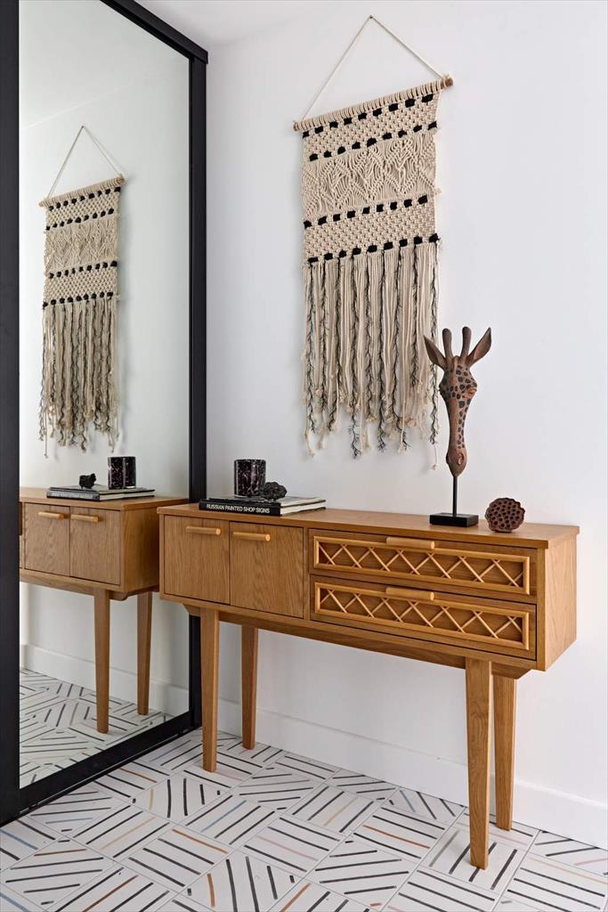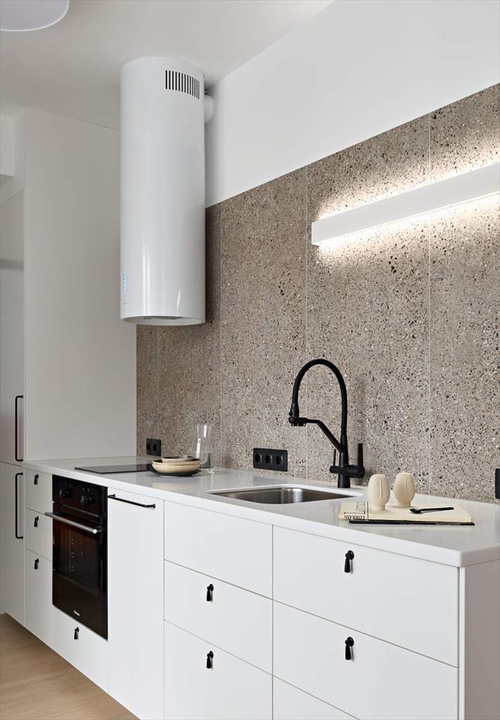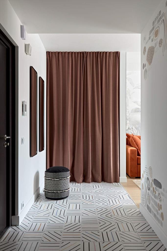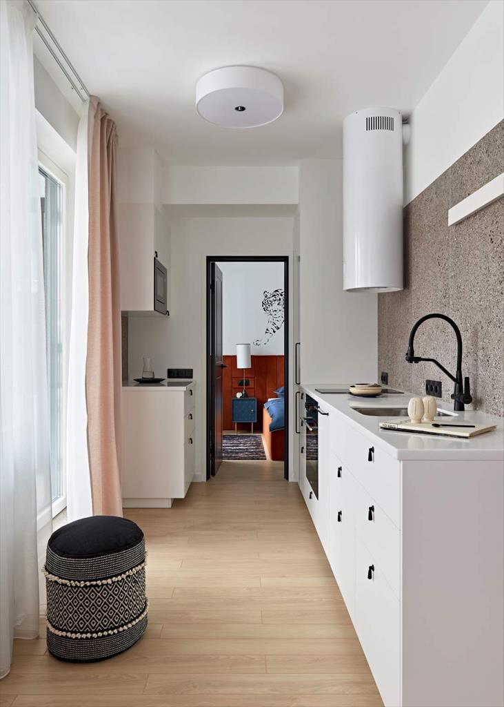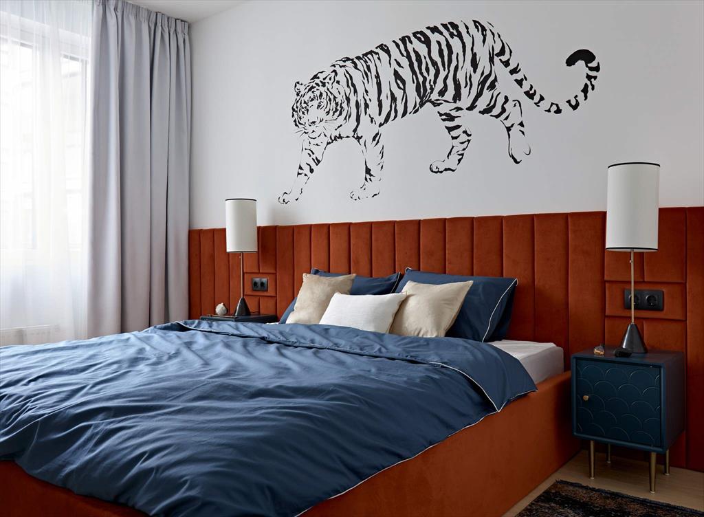 Квартира складывается из неочевидных контрастов: спокойная светлая основа - и глубокие оттенки марокканской пустыни и синего моря; прохлада натурального дерева и кожи - и бархатистое тепло мягкой обивки, спокойные белые кухонные фасады - и натуральный камень со своим характером. Отдельное вдохновение - расписанные стены. Тигра поселили в спальне, а в гостиной нарисовали для него настоящие джунгли. Дизайнеры использовали много зеркал, таким образом и так светлые комнаты стали еще светлее и просторнее.