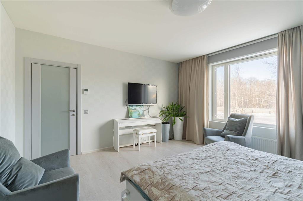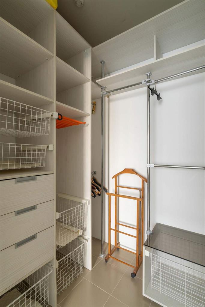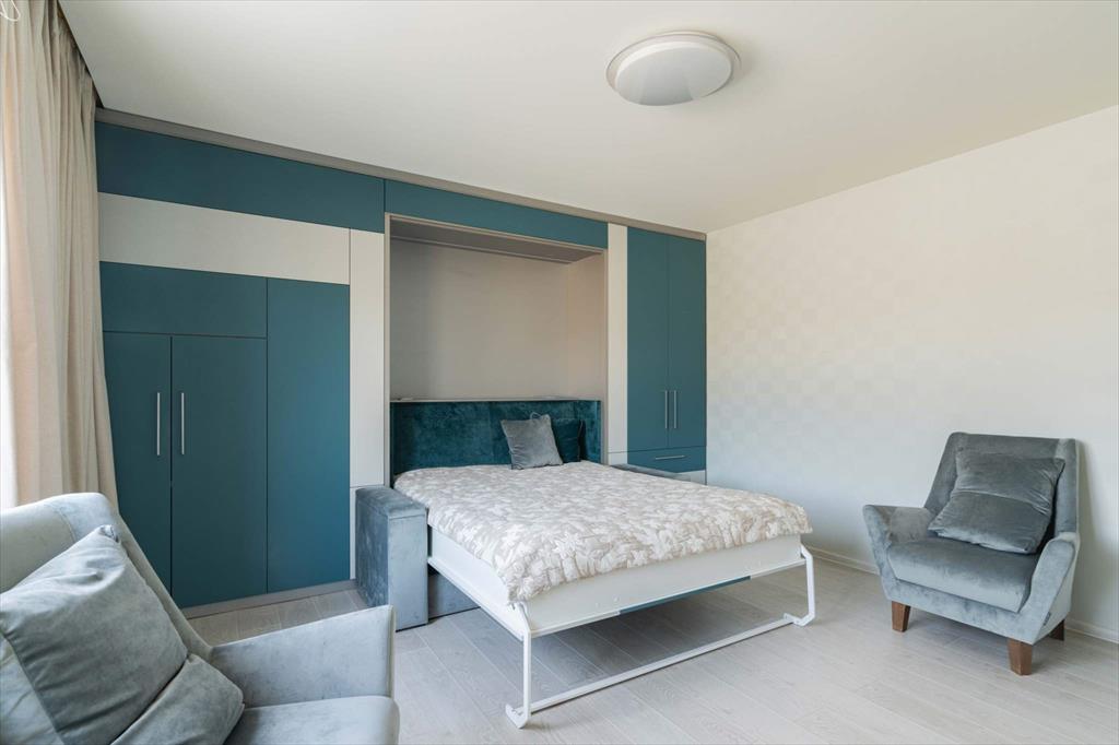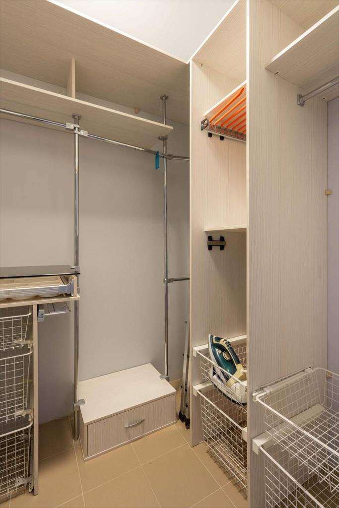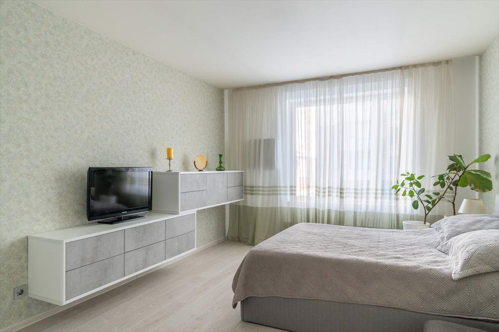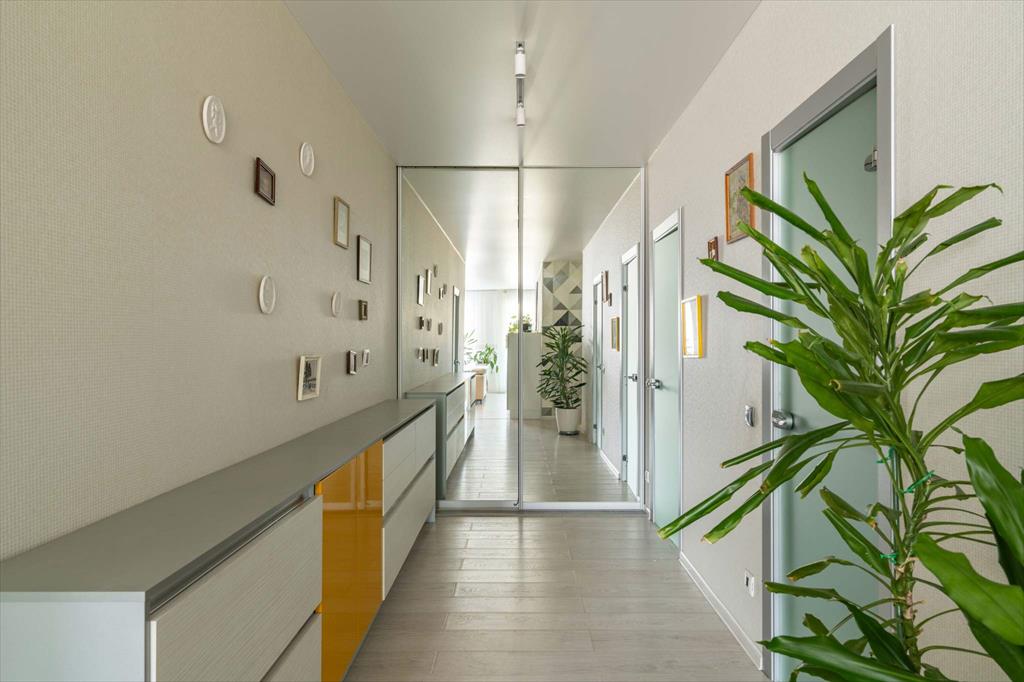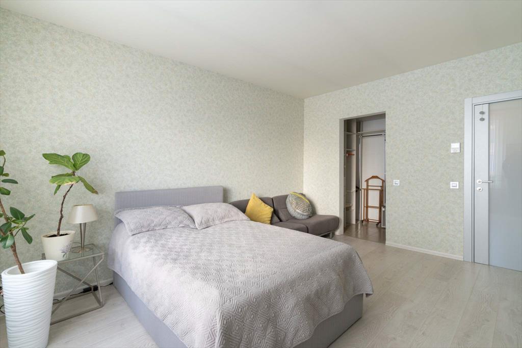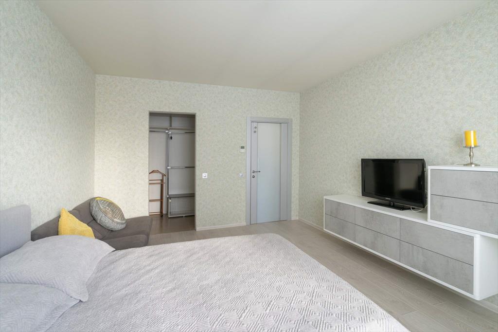 В квартире имеются большая, светлая и уютная кухня-гостиная, две отдельные спальни, одна из которых с гардеробной, два санузла и еще одна отдельная гардеробная. Квартира оборудована всей необходимой техникой: вместительный холодильник и дополнительная морозильная камера, кондиционер, варочная панель, духовой шкаф, микроволновая печь, телевизор, посудомоечная машина и измельчитель отходов. Кроме того, оба санузла оснащены теплым полом. В кухне-гостиной располагается укомплектованное рабочее место, а утепленный балкон позволяет наслаждаться им круглый год. Два вместительных гардероба — один в главной спальне, а второй в коридоре — помогут организовать пространство и удобно хранить вещи.